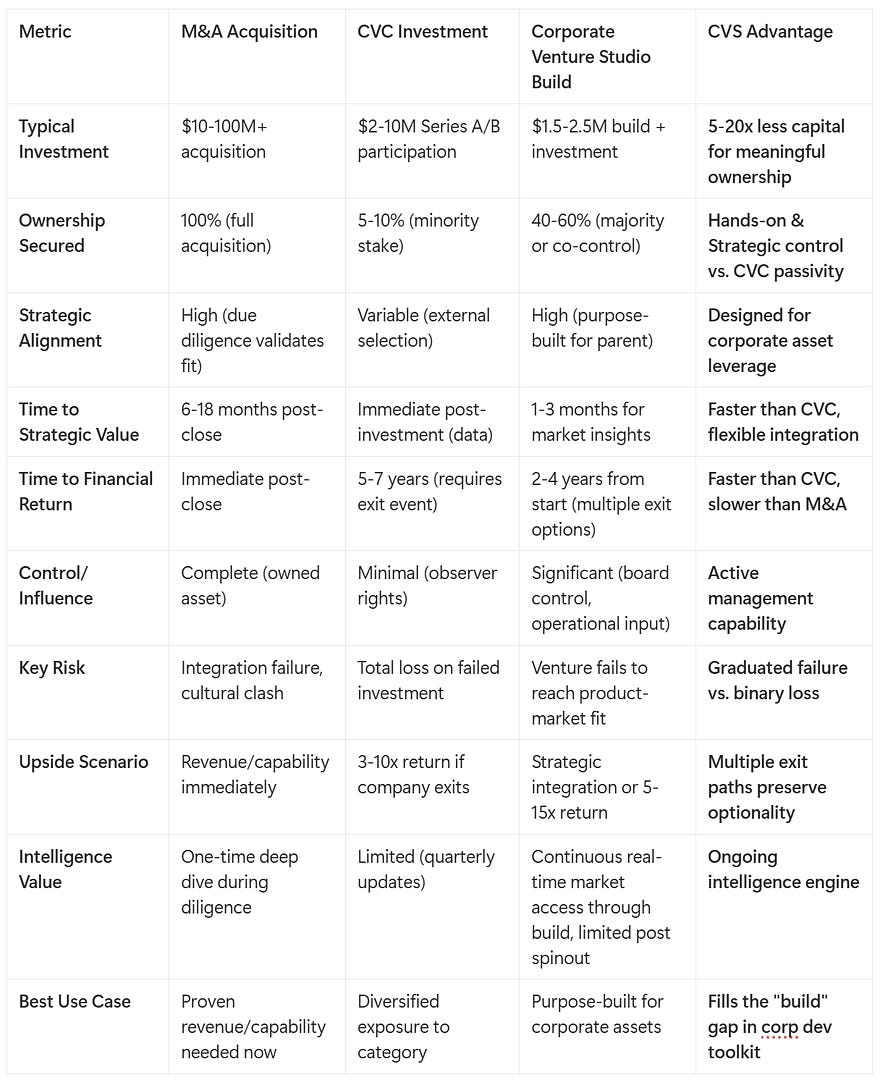 Portfolio Construction Implications: Each approach serves different strategic needs. M&A delivers immediate capability but requires significant capital and carries integration risk. CVC provides portfolio diversification but minimal control and long liquidity timelines. Studios build purpose-designed ventures with meaningful ownership at lower capital intensity, generating continuous market intelligence as a byproduct.