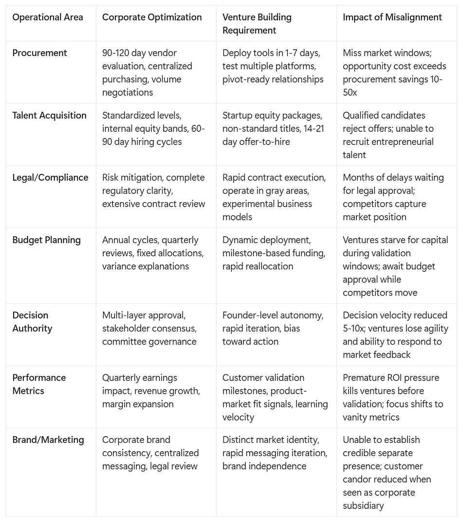 Corporate environments optimize for different objectives than venture building requires. Large organizations succeed through process consistency, risk management, and coordinated execution across thousands of employees. These characteristics create value in mature operations but undermine venture building where speed, experimentation, and tolerance for failure determine outcomes.