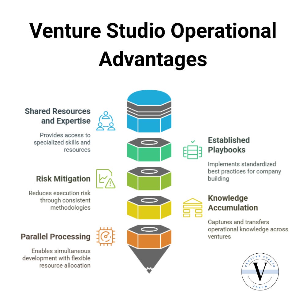 Venture studios leverage economies of scale by distributing specialized operational resources across multiple portfolio companies. This enables access to expertise in product development, marketing, finance, and other functions that early-stage companies typically cannot afford individually.